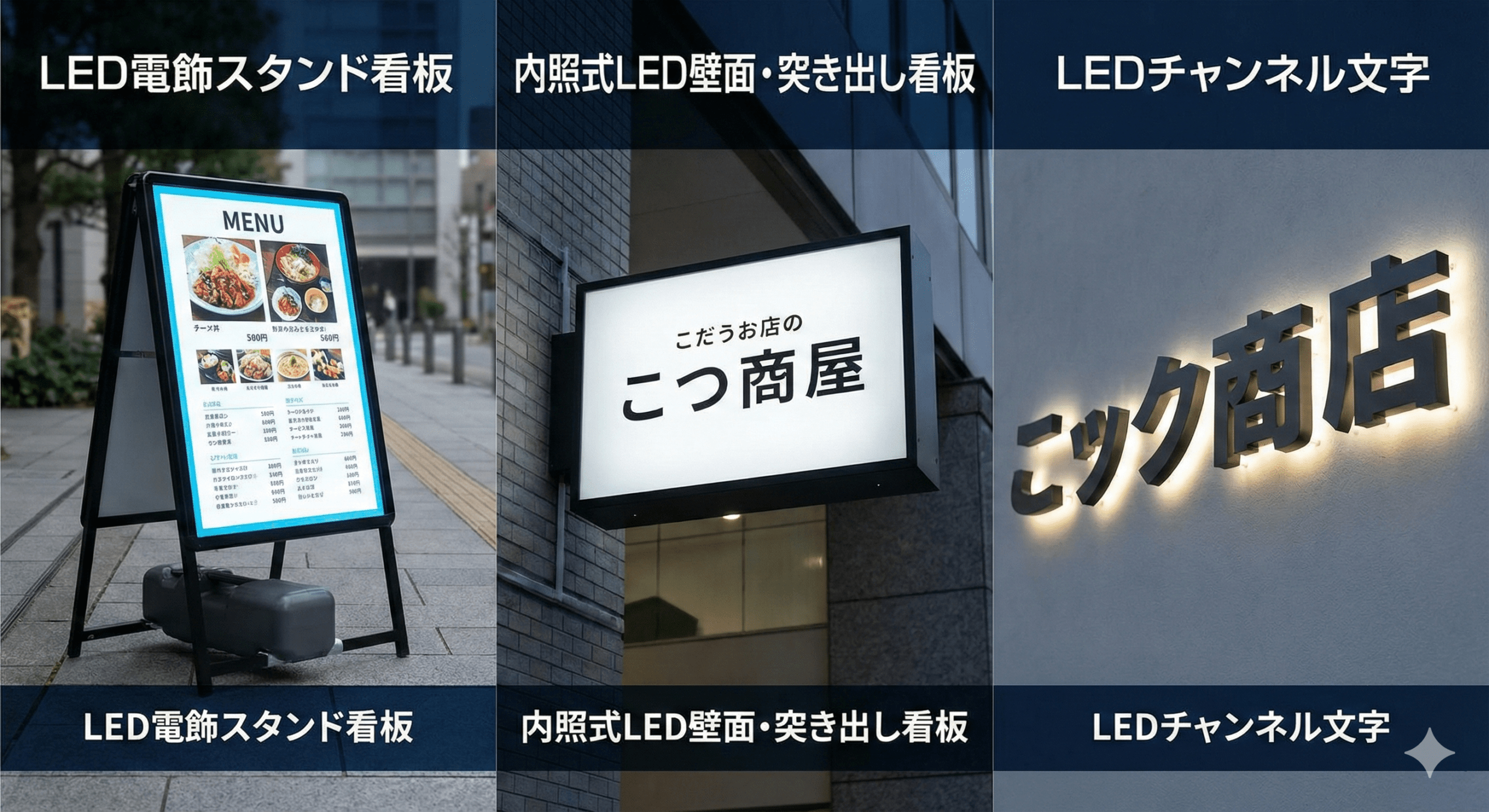 LEDを搭載した看板には、さまざまな種類があります。立地や業種に合わせて、最適なタイプを選ぶことが成功の鍵です。